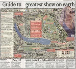 Tonight's edition of London newspaper the Evening Standard features a venue guide for those fans going to the concert on Saturday. The newspaper's listings guide Metrolife also features Madonna on the front cover. Click to enlarge.