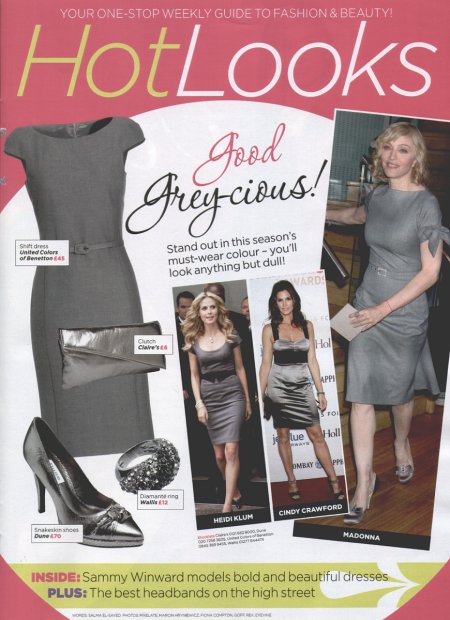 UK celebrity magazine Closer (27 October - 02 November issue) uses Madonna recent look at the recent GQ Awards to illustrate an article on why grey is the colour to be seen in this season.